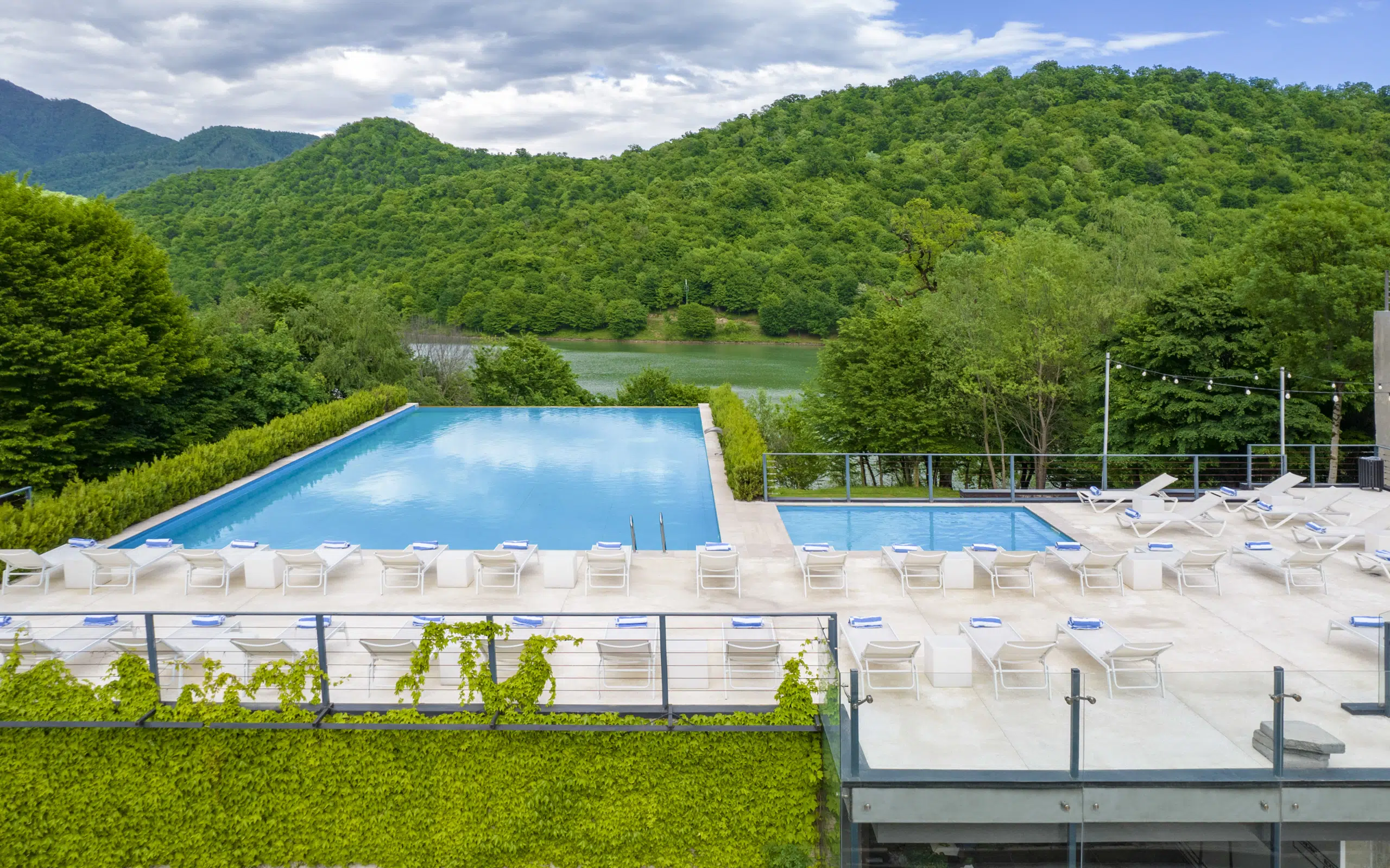 The resort serves as a unique venue for family gatherings, business meetings, events, and weddings. From the cozy terrace of the hotel and from each room, guests can indulge in panoramic views of the Alazani Valley, the 44-hectare natural lake, and the surrounding forests.
